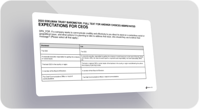 50 2022 EDELMAN TRUST BAROMETER: FULL TEXT FOR ANSWER CHOICES ABBREVIATED EXPECTATIONS FOR CEOS Shortened Full The CEO The CEO A corporate executive responsible for guiding the company on social issues A corporate executive responsible for guiding the company on social issues such as the head of Diversity, Equity and Inclusion (DEI), the head of social impact or corporate social responsibility, the Chief Sustainability Officer, etc. The local CEO in the country or region The local or regional CEO or senior leader of the business in the country or region most affected by the actions the company is planning to take A member of the Board of Directors A member of their Board of Directors The Chief Communications Officer or head of communications The Chief Communications Officer or head of communications DRV_FOR . If a company wants to communicate credibly and effectively to you about its stand on a contentious social or geopolitical issue, and what actions it is planning to take to address that issue, who should they use to deliver their message? (Please select all that apply.)