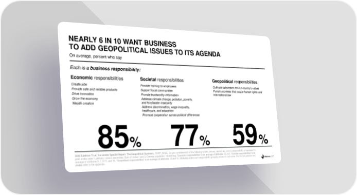 17 Create jobs Provide safe and reliable products Drive innovation Grow the economy Wealth creation Provide training to employees Support local communities Provide trustworthy information Address climate change, pollution, poverty, and food/water insecurity Address discrimination, wage inequality, healthcare, and education Promote cooperation across political differences 85 % Economic responsibilities 77 % Societal responsibilities Cultivate admiration for our country's values Punish countries that violate human rights and international law 59 % Geopolitical responsibilities On average, percent who say NEARLY 6 IN 10 WANT BUSINESS TO ADD GEOPOLITICAL ISSUES TO ITS AGENDA 2022 Edelman Trust Barometer Special Report: The Geopolitical Business. CORP_ROLE. Do you consider each of the following to be a primary, secondary, or not a responsibility of business? 3 - point scale; code 1, primary; code 2, secondary. Sum of codes 1 and 2. General population, 14 - mkt avg. “Economic responsibilitie s” is an average of attributes 1 - 2, 4 - 6. “Societal responsibilities” is an average of attributes 3, 7, 9 - 11, and 13. “Geopolitical responsibilities” is an average of attributes 12 and 14. Attributes unde r each responsibility grouping shown in rank order. For the full question text, please refer to the appendix. Each is a business responsibility:
