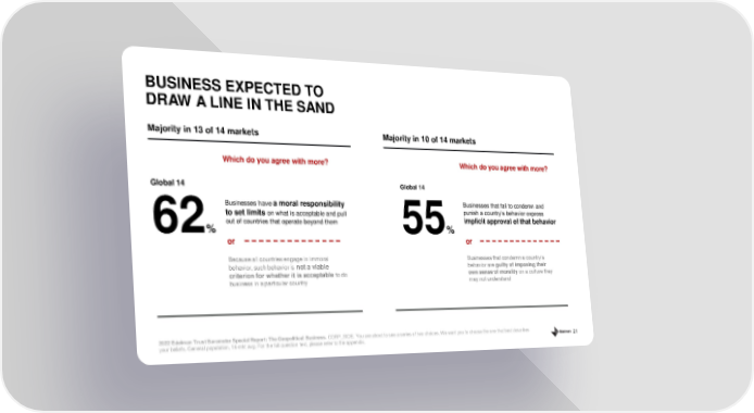 21 Majority in 10 of 14 markets Majority in 13 of 14 markets BUSINESS EXPECTED TO DRAW A LINE IN THE SAND 2022 Edelman Trust Barometer Special Report: The Geopolitical Business. CORP_SIDE. You are about to see a series of two choices. We want you to choose the one that best describes your beliefs. General population, 14 - mkt avg. For the full question text, please refer to the appendix. 55 % or Global 14 Businesses that fail to condemn and punish a country’s behavior express implicit approval of that behavior Businesses that condemn a country’s behavior are guilty of imposing their own sense of morality on a culture they may not understand Which do you agree with more? 62 % or Businesses have a moral responsibility to set limits on what is acceptable and pull out of countries that operate beyond them Because all countries engage in immoral behavior, such behavior is not a viable criterion for whether it is acceptable to do business in a particular country Which do you agree with more? Global 14