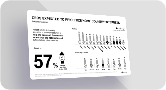 24 Percent who agree CEOS EXPECTED TO PRIORITIZE HOME COUNTRY INTERESTS 2022 Edelman Trust Barometer Special Report: The Geopolitical Business. CEO_AGR. Thinking about CEOs, how strongly do you agree or disagree with the following statements? 9 - point scale; top 4 box, agree. General population, 14 - mkt avg. 58 55 60 56 54 52 58 64 Men Women 18-34 35-54 55+ Low Middle High Change, May 2021 to May 2022 - 0 + 77 72 64 62 62 61 55 55 55 55 55 48 47 26 Global 14 57 % Markets Change , May 2021 to May 202 2 +3 pts +8 +5 +4 +3 +2 +6 +7 +4 - 2 +4 - 2 - 1 - 7 +1 +4 0 +8 - 2 +1 +7 0 +4 Gender | Age | Income A global CEO's first priority should be to use their resources to help the people of the country where they are headquartered before helping other countries