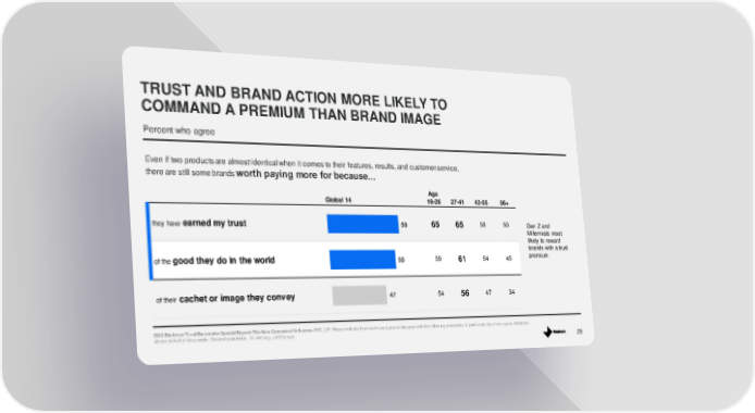 Percent who agree TRUST AND BRAND ACTION MORE LIKELY TO COMMAND A PREMIUM THAN BRAND IMAGE Even if two products are almost identical when it comes to their features, results, and customer service, there are still some brands worth paying more for because... Global 14 Age 18 - 26 27 - 41 42 - 55 56+ they have earned my trust 65 65 58 50 of the good they do in the world 59 61 54 45 of their cachet or image they convey 54 56 47 34 47 55 59 Gen Z and Millennials most likely to reward brands with a trust premium 29 2022 Edelm an Trust Barometer Special Report: The New Cascade of Influence. BRD_OP. Please indicate how much you agree or disagree w ith the f ollow ing statements. 9 - point scale; top 4 box, agree. Attribute s show n to half of the sample. General population, 14 - mkt avg., and by age.