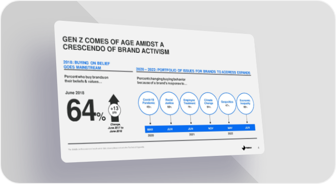 GEN Z COMES OF AGE AMIDST A CRESCENDO OF BRAND ACTIVISM For details on the source of each set of data above please ref er to the Technical Appendix. 4 Covid - 19 Pandemic 45 % Racial Justice 60 % Employee Treatment 75 % Climate Change 64 % Geopolitics 47 % Economic Inequality 60 % MAR JUN JUN NOV JUN MAY 2020 2021 2022 Percent who buy brands on their beliefs & values... 2018: BUYING ON BELIEF GOES MAINSTREAM 2020 – 2022: PORTFOLIO OF ISSUES FOR BRANDS TO ADDRESS EXPANDS Percent changing buying behavior because of a brand’s response to... 64 % June 2018 Change, June 2017 to June 2018 +13 pts