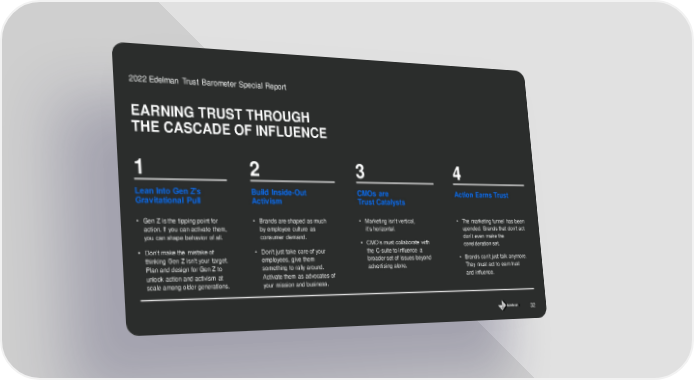 EARNING TRUST THROUGH THE CASCADE OF INFLUENCE 32 2022 Edelman Trust Barometer Special Report Lean Into Gen Z’s Gravitational Pull • Gen Z is the tipping point for action. If you can activate them, you can shape behavior of all. • Don’t make the mistake of thinking Gen Z isn’t your target. Plan and design for Gen Z to unlock action and activism at scale among older generations. Build Inside - Out Activism • Brands are shaped as much by employee culture as consumer demand. • Don’t just take care of your employees, give them something to rally around. Activate them as advocates of your mission and business. CMOs are Trust Catalysts • Marketing isn’t vertical, it’s horizontal. • CMO’s must collaborate with the C - suite to influence a broader set of issues beyond advertising alone. Action Earns Trust • The marketing funnel has been upended. Brands that don’t act don’t even make the consideration set. • Brands can’t just talk anymore. They must act to earn trust and influence. 1 2 3 4