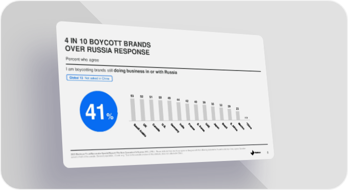 53 52 51 50 49 44 42 40 39 35 32 29 23 n/a 4 IN 10 BOYCOTT BRANDS OVER RUSSIA RESPONSE I am boycotting brands still doing business in or with Russia 8 Percent who agree 41 % Global 13 Not asked in China 2022 Edelm an Trust Barometer Special Report: The New Cascade of Influence. BRD_OPIN1. Please indicate how much you agree or disagree w ith the f ollow ing statements. 9 - point scale; top 4 box, agree. Questi on asked of half of the sample. General population, 13 - mkt avg. * Due to the sensitive nature of this attribute, d ata not collected in China.