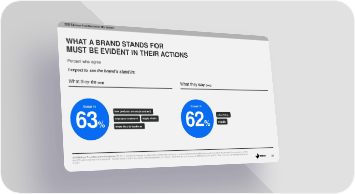 2022 Edelman Trust Barometer May Update WHAT A BRAND STANDS FOR MUST BE EVIDENT IN THEIR ACTIONS What they say (avg) What they do (avg) I expect to see the brand’s stand in: Percent who agree 2022 Edelman Trust Barometer May Update 26 62 % how products are made and sold employee treatment supply chain where they do business advertising website 2022 Edelm an Trust Barometer May Update. EB_Q51. If a brand or company is really serious about taking a stand on a controversial societal or political issue, w here an d h ow do you expect to see evidence of that stand? 9 - point scale; top 4 box, important. Question asked of half of the sample. General population, 14 - mkt avg. “What they do” is an average of attributes 8, 9, 11, and 13; “What they say” is an average of attributes 2 and 3. Global 14 63 % Global 14