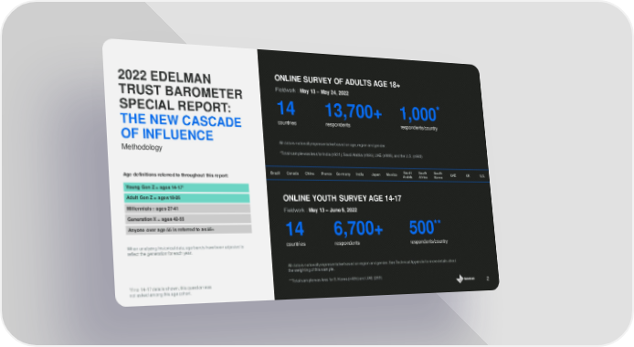 Age definitions referred to throughout this report: Young Gen Z = ages 14 - 17 1 Adult Gen Z = ages 18 - 26 Millennials = ages 27 - 41 Generation X = ages 42 - 55 An yone over age 55 is referred to as 56+ When analyzing historical data, age bands have been adjusted to reflect the generation for each year. 1 If no 14 - 17 data is shown, this question was not asked among this age cohort. Methodology 2 ONLINE SURVEY OF ADULTS AGE 18+ Fieldwork : May 13 – May 24, 2022 14 13,700+ 1,000 * countries respondents respondents/country All data is nationally representative based on age, region and gender. *Total sample was less for India (n931), Saudi Arabia (n895), UAE (n888), and the U.S. (n993) ONLINE YOUTH SURVEY AGE 14 - 17 Fieldwork : May 13 – June 6, 2022 14 6,700+ 500 ** countries respondents respondents/country All data is nationally representative based on region and gender. See Technical Appendix for more details about the weighting of this sample. **Total sample was less for S. Korea (n495) and UAE (283) 2022 EDELMAN TRUST BAROMETER SPECIAL REPORT: THE NEW CASCADE OF INFLUENCE Brazil Canada China France Germ any India Japan Mexico Saudi Arabia South Africa South Korea UAE UK U.S.