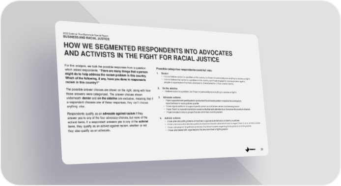 For this analysis, we took the possible responses from a question which asked respondents: “ There are many things that a person might do to help address the racism problem in this country. Which of the following, if any, have you done in response to racism in this country?” The possible answer choices are shown on the right, along with how those answers were categorized. The answer choices shown underneath denier and on the sideline are exclusive, meaning that if a respondent chooses one of these responses, they can’t choose anything else. Respondents qualify as an advocate against racism if they answer yes to any of the four advocacy choices, but none of the activist items. If a respondent answers yes to any of the activist items, they qualify as an activist against racism, whether or not they also qualify as an advocate. Possible categories respondents could fall into: 1. Denier: • I do not believe racism is a problem in this country, so I have not personally done anything to address or fight it • I do not believe that racism is a problem in this country, and I have engaged in counter protests against people or organizations that have attempted to characterize the U.S.as a racist country. 2. On the sideline • I believe racism is a problem, but I have not personally done anything to address or fight it. 3. Advocate actions: • I have supported and participated in product and business boycotts in response to a company’s racist behavior or racist policies quartile • I have signed petitions to support specific actions and initiatives aimed at addressing racism • I have “liked” or reposted content on social media that calls attention to or discusses the problem of racism • I have donated money to groups that are committed to ending racism 4. Activist actions: • I have attended public protests or marches to oppose racist behavior, incidents, or policies • I have communicated directly to political or business leaders about what I want or expect them to do to address racism • I have campaigned for political candidates that share my views regarding the importance of ending racism • I have volunteered with organizations that are committed to fighting racism 2022 Edelman Trust Barometer Special Report BUSINESS AND RACIAL JUSTICE HOW WE SEGMENTED RESPONDENTS INTO ADVOCATES AND ACTIVISTS IN THE FIGHT FOR RACIAL JUSTICE 39
