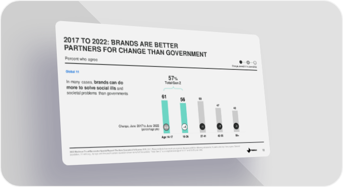 Percent who agree 2017 TO 2022: BRANDS ARE BETTER PARTNERS FOR CHANGE THAN GOVERNMENT 18 Change, June 2017 to June 2022 (percentage pts) Change, June 2017 to June 2022 - 0 + 61 56 60 47 42 Age 14-17 18-26 27-41 42-55 56+ In many cases, brands can do more to solve social ills and societal problems than governments 57 % Total Gen Z 2022 Edelm an Trust Barometer Special Report: The New Cascade of Influence. BDB_Q17. Please indicate how much you agree or disagree w ith the f ollow ing statements. 9 - point scale; top 4 box, agree. General population, 11 - mkt avg., by age ; and the youth sample (question show n to half of the sample). “Total Gen Z” is a w eighted average of 14 - 17 - and 18 – 26 - year - olds . Global 11 n/a +5 - 1 - 7 - 1