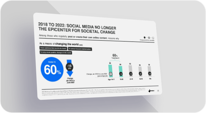 Among those who regularly post or create their own online content , reasons why 2018 TO 2022: SOCIAL MEDIA NO LONGER THE EPICENTER FOR SOCIETAL CHANGE 22 As a means of changing the world ( net) 66 59 63 56 58 Age 14-17 18-26 27-41 42-55 56+ Change, Jan 2018 to June 2022 (percentage pts) 60 % Global 13 Change, Jan 2018 to June 2022 - 16 pts Change, Jan 2018 to June 2022 - 0 + I have opinions that need to be heard To help create positive changes in the world To correct lies and misinformation 60 % Total Gen Z 2022 Edelm an Trust Barometer Special Report: The New Cascade of Influence. MED_SEG_REG. Why do you regularly create and post your ow n opinions, stories, blogs, podcasts, images, memes, videos, or new s items on social media platf orms or other online sites? Pick all that apply. General population, 13 - mkt avg. (excl. Saudi Arabia) , and by age; and the youth sample (question show n to half of the sample). “Total Gen Z” is a w eighted average of 14 - 17 - and 18 – 26 - year - olds . Data show n is a net of attributes 3, 5 and 7, and f iltered to be among those w ho create their ow n online content w eekly or mo re (MED_SEG_OFTr14/c4 - 7). n/a - 15 - 12 - 21 - 19