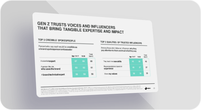 TOP 3 QUALITIES OF TRUSTED INFLUENCERS GEN Z TRUSTS VOICES AND INFLUENCERS THAT BRING TANGIBLE EXPERTISE AND IMPACT 21 Among those who follow an influencer, why they pay attention to them and trust what they say Age 14 - 17 18 - 26 Total Gen Z They teach me new skills 45 39 40 Recommendations based on experience 40 37 37 Share my values 38 36 35 Percent who say each would be credible as a brand spokesperson/ambassador TOP 3 CREDIBLE SPOKESPEOPLE Age 14 - 17 18 - 26 Total Gen Z A scientist/ expert 67 66 66 A person like me who uses the brand 63 62 61 A brand technical expert 58 59 58 2022 Edelm an Trust Barometer Special Report: The New Cascade of Influence. ABILITY_SPK_A. If a brand w ere to use each of the f ollow ing as their spokesperson/brand ambassador, how credible or believabl e w ould you consider them to be? 4 - point scale; top 2 box, credible. INFLU_TRU. Why do you pay attention to and trust w hat the inf luencers that you f ollow have to say? Pick all that apply. Question asked to those w ho f ollow inf luencers (INFLU1_A/1). General population, 14 - mkt avg., by age; and the youth sample (question show n to half of the sa mple). “Total Gen Z” is a w eighted average of 14 - 17 - and 18 – 26 - year - olds. Order is based on top 3 rank f or Total Gen Z, ties broken by decimals.