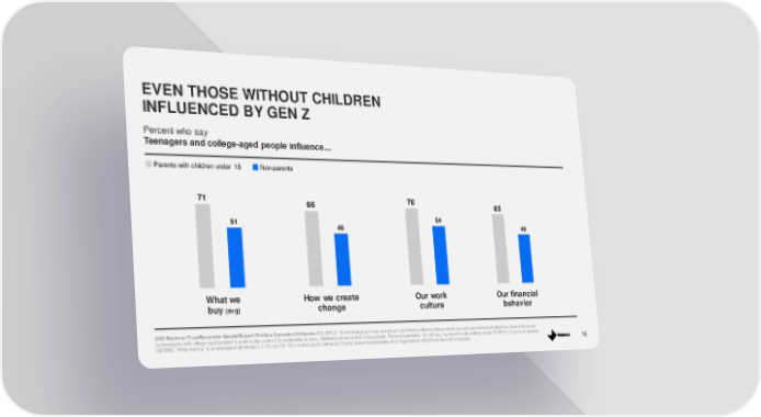 71 51 What we buy (avg) 70 54 Our work culture 66 46 How we create change 65 46 Our financial behavior 16 EVEN THOSE WITHOUT CHILDREN INFLUENCED BY GEN Z Percent who say Teenagers and college - aged people influence... 2022 Edelm an Trust Barometer Special Report: The New Cascade of Influence. KID_INFLU. To w hat degree, if any, w ould you say that the f ollow ing things about you and your behavior today have been inf lue nce d by teenagers and college - aged people? 5 - point scale; codes 3 - 5, moderately or more. Attributes show n to half of the sample. Gene ral population, 14 - mkt avg., by parents w ith children under 18 (S21/1 - 2) and non - parents (S21/98). “What w e buy” is an average of attributes 1, 4 - 10, and 13. “Our w ork culture” (attribute 17) only shown to employees of an organization (Q43/1) across the full sample. Non - parents Parents with children under 18
