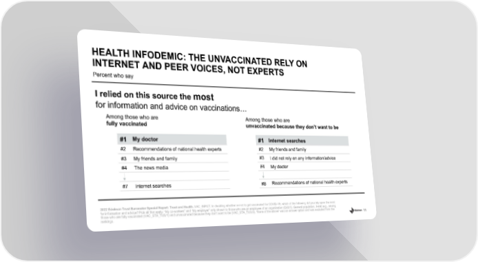 11 Percent who say HEALTH INFODEMIC: THE UNVACCINATED RELY ON INTERNET AND PEER VOICES, NOT EXPERTS 2022 Edelman Trust Barometer Special Report: Trust and Health. VAC_INPUT. In deciding whether or not to get vaccinated for COVID - 19, which of the following did you rely upon the most for information and advice? Pick all that apply. “My co - workers” and “My employer” only shown to those who are an employee of an organization (Q43/1). General population, 9 - mkt avg., among those who are fully vaccinated (VAC_STA_TUS/1) and unvaccinated because they don’t want to be (VAC_STA_TUS/3). “None of the above” was an answer option and was excluded from the rankings. Among those who are unvaccinated because they don’t want to be I relied on this source the most for information and advice on vaccinations... Among those who are fully vaccinated #1 My doctor #2 Recommendations of national health experts #3 My friends and family #4 The news media #7 Internet searches #1 Internet searches #2 My friends and family #3 I did not rely on any information/advice #4 My doctor #8 Recommendations of national health experts