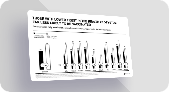 17 Percent who are fully vaccinated , among those with lower vs. higher trust in the health ecosystem THOSE WITH LOWER TRUST IN THE HEALTH ECOSYSTEM FAR LESS LIKELY TO BE VACCINATED 2022 Edelman Trust Barometer Special Report: Trust and Health. VAC_STA_TUS. Which of the following best describes your current vaccine status? General population, 9 - mkt avg., by level of trust in health ecosystem. For full details on how the Health Ecosystem Trust scale was built, please refer to the T ech nical Appendix. *Nigeria is not included in the global average. Data is rebased to exclude those who selected “prefer not to answer.” 61 82 Lower trust in the health ecosystem Higher trust in the health ecosystem 21 pts Gap 46 61 64 68 41 21 68 49 82 61 84 89 90 92 62 42 88 68 97 74 U.S. France Canada Germany Japan *Nigeria UK S. Korea China Mexico 38 13 28 26 24 21 21 20 15 19 Global 9