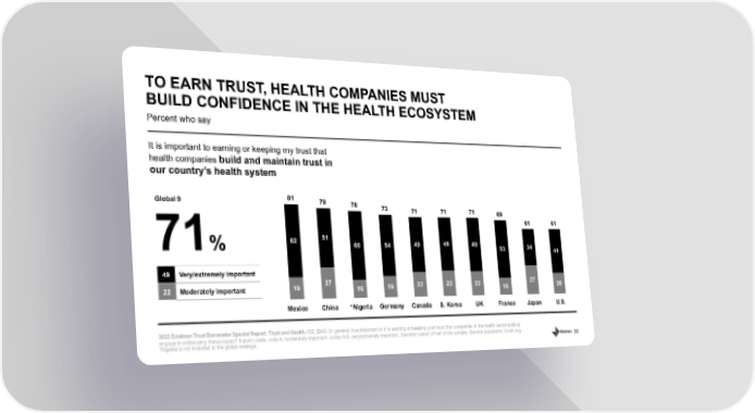 30 Percent who say TO EARN TRUST, HEALTH COMPANIES MUST BUILD CONFIDENCE IN THE HEALTH ECOSYSTEM 2022 Edelman Trust Barometer Special Report: Trust and Health. ISS_ENG. In general, how important is it to earning or keeping your trust that companies in the health sector publicly engage in addressing these issues? 6 - point scale; code 4, moderately important; codes 5 - 6, very/extremely important. Question asked of half of the sample. General population, 9 - mkt avg. * Nigeria is not included in the global average. It is important to earning or keeping my trust that health companies build and maintain trust in our country’s health system 71 % Global 9 19 27 16 19 22 23 22 16 27 20 62 51 60 54 49 48 49 53 34 41 81 78 76 73 71 71 71 69 61 61 Mexico China *Nigeria Germany Canada S. Korea UK France Japan U.S. 49 Very/extremely important 22 Moderately important