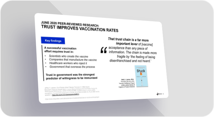 2 JUNE 2020 PEER - REVIEWED RESEARCH: TRUST IMPROVES VACCINATION RATES Jeffrey V. Lazarus ,Scott Ratzan,Adam Palayew,Francesco C. Billari,Agnes Binagwaho,Spencer Kimball,Heidi J. Larson,Alessia Melegaro,Kenneth Rabin,Trenton M. White,Ayman El - Mohandes . (2020) COVID - SCORE: A global survey to assess public perceptions of government responses to COVID - 19 (COVID - SCORE - 10). PLoS ONE 15(10): e0240011. https://doi.org/10.1371/journal.pone.0240011 https://www.newyorker.com/science/annals - of - medicine/heidi - larson - vaccine - anthropologist A successful vaccination effort requires trust in: • Scientists who create the vaccine • Companies that manufacture the vaccine • Healthcare workers who inject it • Government that overseas the process Trust in government was the strongest predictor of willingness to be immunized That trust chain is a far more important lever of [vaccine] acceptance than any piece of information. The chain is made more fragile by ‘the feeling of being disenfranchised and not heard.’ Key findings “ Heidi J. Larson, PhD, Founding Director of the Vaccine Confidence Project at the London School of Hygiene & Tropical Medicine