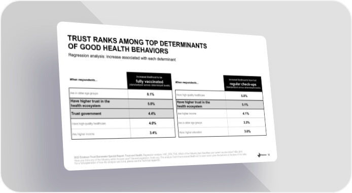 16 Regression analysis: increase associated with each determinant TRUST RANKS AMONG TOP DETERMINANTS OF GOOD HEALTH BEHAVIORS When respondents... Increased likelihood to be fully vaccinated (standardized across determinant levels) Are in older age groups 8.1% Have higher trust in the health ecosystem 5.0% Trust government 4.4% Have high - quality healthcare 4.0% Are higher income 3.4% When respondents... Increased likelihood to have had regular check - ups (standardized across determinant levels) Have high - quality healthcare 5.8% Have higher trust in the health ecosystem 5.1% Are higher income 4.1% Are in older age groups 3.3% Have higher education 3.0% 2022 Edelman Trust Barometer Special Report: Trust and Health. Regression analysis. VAC_STA_TUS. Which of the following best describes your current vaccine status? HEA_BHV. Have you done any of the following within the past year? General population, 9 - mkt avg. This analysis found the increased likeli hood for each action given the behavior at the items in the table. For a full explanation of how this analysis was done, please see the Technical Appendix.