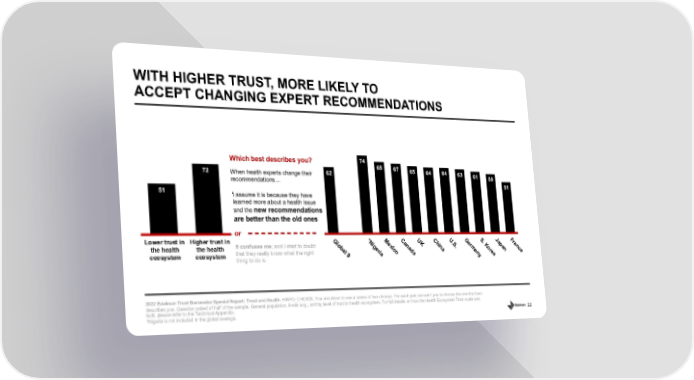 22 WITH HIGHER TRUST, MORE LIKELY TO ACCEPT CHANGING EXPERT RECOMMENDATIONS 2022 Edelman Trust Barometer Special Report: Trust and Health. HINFO_CHOICE. You are about to see a series of two choices. For each pair, we want you to choose the one that best describes you. Question asked of half of the sample. General population, 9 - mkt avg., and by level of trust in health ecosystem. For full details on how the Health Ecosystem Trust sc ale was built, please refer to the Technical Appendix. *Nigeria is not included in the global average. Which best describes you? or 62 74 68 67 65 64 64 63 61 59 51 Global 9 *Nigeria Mexico Canada UK China U.S. Germany S. Korea Japan France 51 72 Lower trust in the health ecosystem Higher trust in the health ecosystem It confuses me ; and I start to doubt that they really know what the right thing to do is I assume it is because they have learned more about a health issue and the new recommendations are better than the old ones When health experts change their recommendations...
