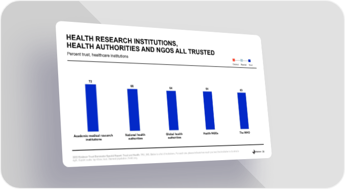 38 Percent trust, healthcare institutions HEALTH RESEARCH INSTITUTIONS, HEALTH AUTHORITIES AND NGOS ALL TRUSTED 2022 Edelman Trust Barometer Special Report: Trust and Health. TRU_INS. Below is a list of institutions. For each one, please indicate how much you trust that institution to do what is right. 9 - point scale; top 4 box, trust. General population, 9 - mkt avg. 72 66 64 64 63 Academic medical research institutions National health authorities Global health authorities Health NGOs The WHO Distrust Neutral Trust