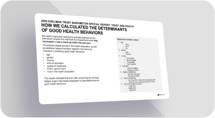 43 2022 EDELMAN TRUST BAROMETER SPECIAL REPORT: TRUST AND HEALTH HOW WE CALCULATED THE DETERMINANTS OF GOOD HEALTH BEHAVIORS We used a regression analysis to evaluate potential drivers that would increase the likelihood that respondents were fully vaccinated or had a check - up within the past year. The analysis looked at trust in the health ecosystem, as well as additional factors that other research has found are important in predicting good health behaviors: • age • gender • income • level of education • quality of healthcare • trust in government • trust in the health ecosystem The results indicated that even after accounting for all these factors, trust in the health ecosystem is a top determinant of good health behaviors. Regression variables in detail: 1. Age: • 18 - 34 • 35 - 54 • 55+ 2. Gender • Men • Women 3. Income • First quartile • Second quartile • Third quartile • Fourth quartile 4. Education • Less than college • College and above 5. Quality of healthcare • Less than very good • Very good or better 6. Trust in government • Top 4 box (6 - 9) – those who trust government • Those who do not trust government (1 - 5,99) 7. Trust in the health ecosystem • Lower 33% • Middle 33% • Upper 33%