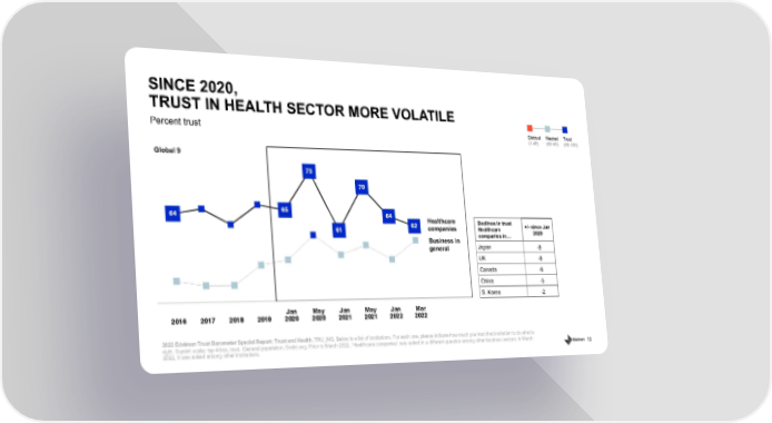 13 64 65 73 61 70 64 62 2016 2017 2018 2019 Jan 2020 May 2020 Jan 2021 May 2021 Jan 2022 Mar 2022 Percent trust SINCE 2020, TRUST IN HEALTH SECTOR MORE VOLATILE 2022 Edelman Trust Barometer Special Report: Trust and Health. TRU_INS. Below is a list of institutions. For each one, please indicate how much you trust that institution to do what is right. 9 - point scale; top 4 box, trust. General population, 9 - mkt avg. Prior to March 2022, “Healthcare companies” was asked in a different question among other business sectors; in March 2022, it was asked among other institutions. Healthcare companies Business in general Global 9 Distrust (1 - 49) Neutral (50 - 59) Trust (60 - 100) Declines in trust Healthcare companies in... +/ - since Jan 2020 Japan - 8 UK - 8 Canada - 6 China - 5 S. Korea - 2
