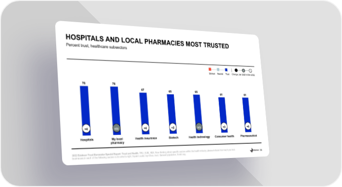 36 Percent trust, healthcare subsectors HOSPITALS AND LOCAL PHARMACIES MOST TRUSTED 2022 Edelman Trust Barometer Special Report: Trust and Health. TRU_SUB_HEA. Now thinking about specific sectors within the health industry, please indicate how much you trust businesses in each of the following sectors to do what is right. 9 - point scale; top 4 box, trust. General population, 9 - mkt avg. 76 76 67 65 65 61 61 Hospitals My local pharmacy Health insurance Biotech Health technology Consumer health Pharmaceutical Distrust Neutral Trust Change, Jan 2020 to Mar 2022 - 0 + +4 n/a +4 +2 n/a +3 +6