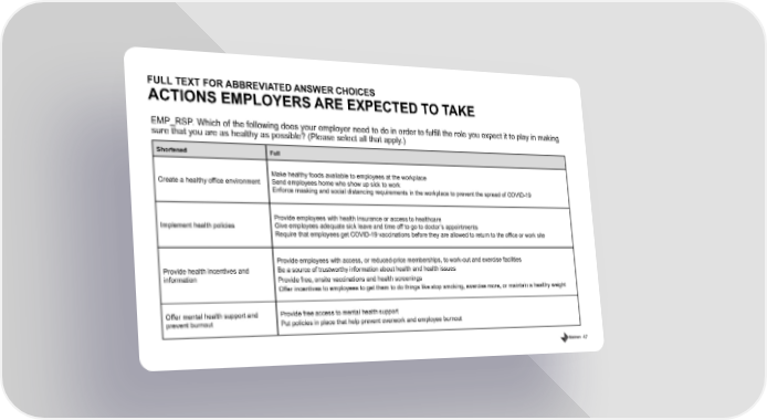 47 FULL TEXT FOR ABBREVIATED ANSWER CHOICES ACTIONS EMPLOYERS ARE EXPECTED TO TAKE Shortened Full Create a healthy office environment Make healthy foods available to employees at the workplace Send employees home who show up sick to work Enforce masking and social distancing requirements in the workplace to prevent the spread of COVID - 19 Implement health policies Provide employees with health insurance or access to healthcare Give employees adequate sick leave and time off to go to doctor’s appointments Require that employees get COVID - 19 vaccinations before they are allowed to return to the office or work site Provide health incentives and information Provide employees with access, or reduced - price memberships, to work - out and exercise facilities Be a source of trustworthy information about health and health issues Provide free, onsite vaccinations and health screenings Offer incentives to employees to get them to do things like stop smoking, exercise more, or maintain a healthy weight Offer mental health support and prevent burnout Provide free access to mental health support Put policies in place that help prevent overwork and employee burnout EMP_RSP. Which of the following does your employer need to do in order to fulfill the role you expect it to play in making sure that you are as healthy as possible? (Please select all that apply.)