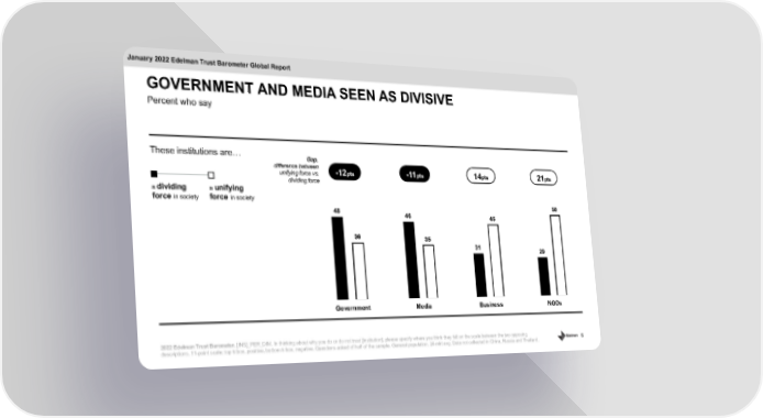 6 Percent who say GOVERNMENT AND MEDIA SEEN AS DIVISIVE 2022 Edelman Trust Barometer. [INS]_PER_DIM. In thinking about why you do or do not trust [institution], please specify where you think they fall on the sc al e between the two opposing descriptions. 11 - point scale; top 5 box, positive; bottom 5 box, negative. Questions asked of half of the sample. General population, 24 - mkt avg. Data not collected in China, Russia and Thailand. 48 46 31 29 36 35 45 50 Government Media Business NGOs a div iding force in society a unifying force in society - 12 pts - 11 pts 14 pts 21 pts Gap , difference between unifying force vs. dividing force These institutions are... GLOBAL 24 Not asked in China, Russia, Thailand January 2022 Edelman Trust Barometer Global Report
