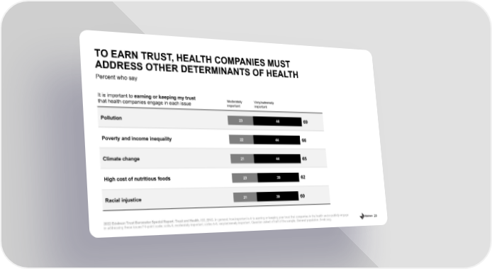29 Pollution Poverty and income inequality Climate change High cost of nutritious foods Racial injustice Percent who say TO EARN TRUST, HEALTH COMPANIES MUST ADDRESS OTHER DETERMINANTS OF HEALTH 2022 Edelman Trust Barometer Special Report: Trust and Health. ISS_ENG. In general, how important is it to earning or keeping your trust that companies in the health sector publicly engage in addressing these issues? 6 - point scale; code 4, moderately important; codes 5 - 6, very/extremely important. Question asked of half of the sample. General population, 9 - mkt avg. 21 23 21 22 23 39 39 44 44 46 60 62 65 66 69 It is important to earning or keeping my trust that health companies engage in each issue Moderately important Very/extremely important