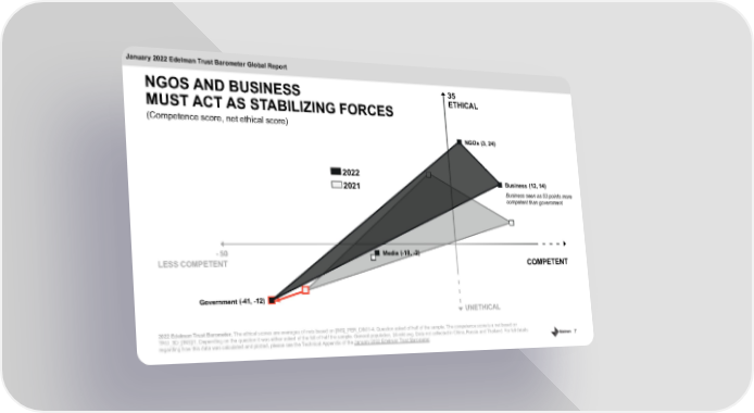 ETHICAL 35 UNETHICAL - 50 LESS COMPETENT COMPETENT 7 ( - 18 , - 2 ) ( 3 , 24 ) ( 12 , 14 ) ( - 41 , - 12 ) (Competence score, net ethical score) NGOS AND BUSINESS MUST ACT AS STABILIZING FORCES 2022 Edelman Trust Barometer. The ethical scores are averages of nets based on [INS]_PER_DIM/1 - 4. Question asked of half of the sample. The competence score i s a net based on TRU_3D_[INS]/1. Depending on the question it was either asked of the full of half the sample. General population, 24 - mkt avg. Da ta not collected in China, Russia and Thailand. For full details regarding how this data was calculated and plotted, please see the Technical Appendix of th e January 2022 Edelman Trust Barometer . GLOBAL 24 Not asked in China, Russia, Thailand Business NGOs Government Media 2022 2021 Business seen as 53 points more competent than government January 2022 Edelman Trust Barometer Global Report
