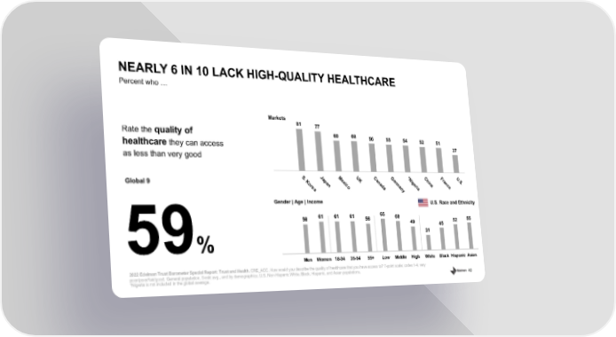 40 56 61 61 61 56 65 60 49 31 45 52 55 Men Women 18-34 35-54 55+ Low Middle High White Black Hispanic Asian Percent who ... NEARLY 6 IN 10 LACK HIGH - QUALITY HEALTHCARE 2022 Edelman Trust Barometer Special Report: Trust and Health. CRE_ACC. How would you describe the quality of healthcare that you have access to? 7 - point scale; codes 1 - 4 , very poor/poor/fair/good. General population, 9 - mkt avg., and by demographics; U.S. Non - Hispanic White, Black, Hispanic, and Asian po pulations. *Nigeria is not included in the global average. Rate the quality of healthcare they can access as less than very good 81 77 60 60 56 55 54 52 51 37 S. Korea Japan Mexico UK Canada Germany *Nigeria China France U.S. Gender | Age | Income Markets Global 9 59 % U.S. Race and Ethnicity