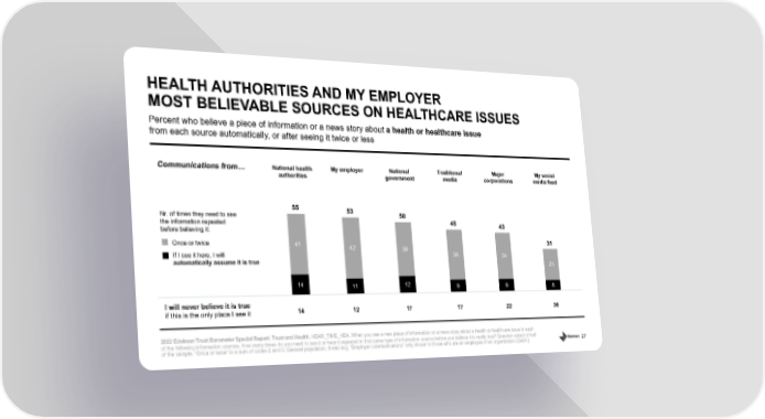27 Percent who believe a piece of information or a news story about a health or healthcare issue from each source automatically, or after seeing it twice or less HEALTH AUTHORITIES AND MY EMPLOYER MOST BELIEVABLE SOURCES ON HEALTHCARE ISSUES 2022 Edelman Trust Barometer Special Report: Trust and Health. HEAR_TIME_HEA. When you see a new piece of information or a news story about a health or healthcare issue in each of the following information sources, how many times do you need to see it or hear it repeated in that same type of informati on source before you believe it is really true? Question asked of half of the sample. “Once or twice” is a sum of codes 2 and 3. General population, 9 - mkt avg. “Employer communications” only shown to those who are an employee of an organization (Q43/1). 14 12 17 17 22 36 14 11 12 9 9 8 41 42 38 36 34 23 55 53 50 45 43 31 If I see it here, I will automatically assume it is true Once or twice Nr. of times they need to see the information repeated before believing it: I will never believe it is true if this is the only place I see it National health authorities My employer National government Traditional media Major corporations My social media feed Communications from...