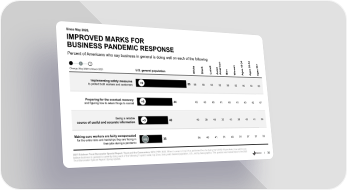 Since May 2020, IMPROVED MARKS FOR BUSINESS PANDEMIC RESPONSE Percent of Americans who say business in general is doing well on each of the following n 34 54 + a - - c n 8 5 5 1 3 5 + e k n ri e - 0 t c inX a n m s s s a t i e e e Change, May 2020 to March 2021 U.S. general population Whi Bl La As Ame Me Wo Ag Ag Ag Implementing safety measures +9 55 56 50 55 52 58 52 50 53 60 to protect both workers and customers Preparing for the eventual recovery +5 44 45 43 49 41 48 41 43 42 47 and figuring how to return things to normal Being a reliable +3 40 40 39 49 32 43 38 42 41 39 source of useful and accurate information Making sure workers are fairly compensated for the extra risks and hardships they are facing in n/a 35 34 40 41 31 40 31 37 37 33 their jobs during a pandemic 2021 Edelman Trust Barometer Special Report: Trust and the Coronavirus. NEW_PER_BUS. When it comes to how it has performed thus far during the COVID-19 pandemic, how well do you believe business in general is currently doing each of the following? 5-point scale; top 2 box, doing well. General population, U.S., and by demographics. This question was tracked back to the 2020 Trust Barometer Special Report: Spring Update. 30