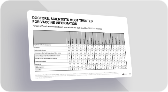 DOCTORS, SCIENTISTS MOST TRUSTED FOR VACCINE INFORMATION Percent of Americans who trust each source to tell the truth about the COVID-19 vaccines T AS T X LE P HE S H TE E A N M E T T . I AN L 34 54 RT W U S S ACK TIN I M - - DE U D U. WH BL LA AS MA FE 18 35 55+ BI TR NO MI SO WE My doctor or healthcare provider 76 78 70 72 73 79 72 70 69 85 81 73 78 77 73 77 Scientists 70 72 68 66 72 75 66 69 66 75 82 57 76 72 65 73 Public health officials 63 63 62 62 71 67 59 62 58 67 75 48 65 65 58 65 Doctors and other health experts you follow online 62 63 54 63 71 67 58 64 60 63 69 58 64 61 59 66 A person like yourself who has taken the vaccine 55 57 51 58 52 58 53 54 53 59 61 54 57 56 54 55 The CEO of the organization you work for 55 57 53 54 48 61 49 59 53 54 59 51 57 52 56 55 Government officials 43 43 45 47 44 49 38 47 43 41 55 31 48 42 43 42 Journalists 43 42 46 47 45 47 38 46 42 41 56 26 47 43 40 44 CEOs in general 34 32 34 41 36 41 27 43 34 26 37 33 34 31 34 35 Celebrities 24 22 32 33 23 28 21 36 29 11 30 19 27 21 25 25 2021 Edelman Trust Barometer Special Report: Trust and the Coronavirus. Q13. Please indicate how much you trust each of the following sources to tell you the truth about COVID-19 vaccines. 9-point scale; top 4 box, trust. General population, U.S., and by demographics. Journalists is an average of attributes 8 and 9. “The CEO of the organization you work for” asked among those who are employed (Q43/1). 34