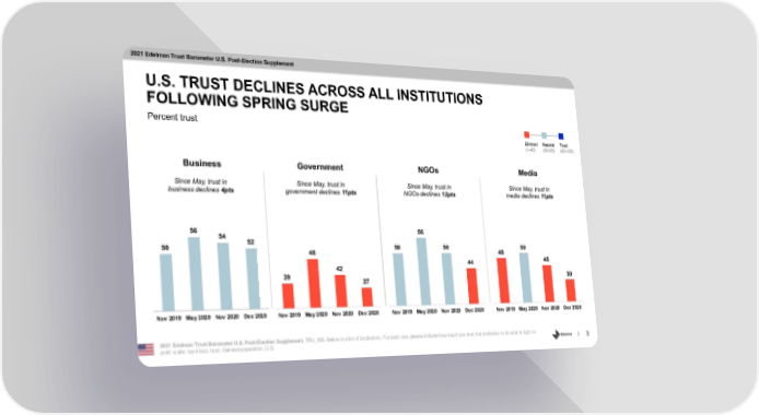 2021 Edelman Trust Barometer U.S. Post-Election Supplement U.S. TRUST DECLINES ACROSS ALL INSTITUTIONS FOLLOWING SPRING SURGE Percent trust Distrust Neutral Trust (1-49) (50-59) (60-100) Business Government NGOs Media Since May, trust in Since May, trust in Since May, trust in Since May, trust in business declines 4pts government declines 11pts NGOs declines 12pts media declines 11pts 56 54 56 50 52 50 50 50 48 48 44 45 42 39 37 39 Nov 2019 May 2020 Nov 2020 Dec 2020 Nov 2019 May 2020 Nov 2020 Dec 2020 Nov 2019 May 2020 Nov 2020 Dec 2020 Nov 2019 May 2020 Nov 2020 Dec 2020 2021 Edelman Trust Barometer U.S. Post-Election Supplement. TRU_INS. Below is a list of institutions. For each one, please indicate how much you trust that institution to do what is right. 9- point scale; top 4 box, trust. General population, U.S. 3