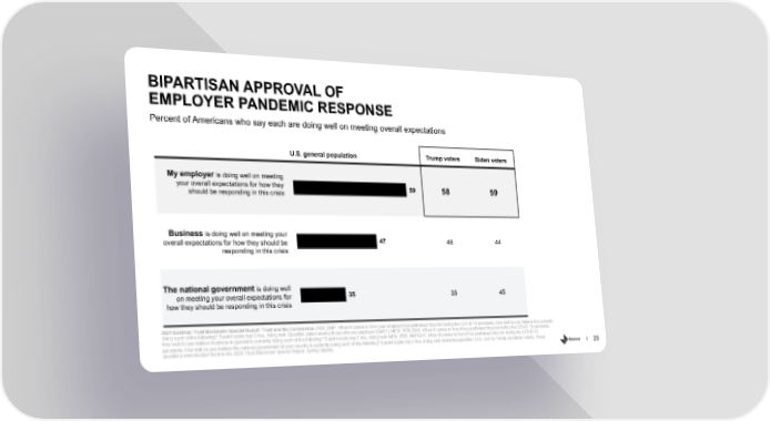 BIPARTISAN APPROVAL OF EMPLOYER PANDEMIC RESPONSE Percent of Americans who say each are doing well on meeting overall expectations U.S. general population Trump voters Biden voters My employer is doing well on meeting your overall expectations for how they 59 58 59 should be responding in this crisis Business is doing well on meeting your 47 overall expectations for how they should be 48 44 responding in this crisis The national government is doing well 35 on meeting your overall expectations for 33 45 how they should be responding in this crisis 2021 Edelman Trust Barometer Special Report: Trust and the Coronavirus. PER_EMP. When it comes to how your employer has performed thus far during the COVID-19 pandemic, how well do you believe it is currently doing each of the following? 5-point scale; top 2 box, doing well. Question asked among those who are employed (Q43/1). NEW_PER_BUS. When it comes to how it has performed thus far during the COVID-19 pandemic, how well do you believe business in general is currently doing each of the following? 5-point scale; top 2 box, doing well. NEW_PER_NATGOV. When it comes to how it has performed thus far during the COVID-19 pandemic, how well do you believe the national government of your country is currently doing each of the following? 5-point scale; top 2 box, doing well. General population, U.S., and by Trump and Biden voters. These questions were tracked back to the 2020 Trust Barometer Special Report: Spring Update. 23