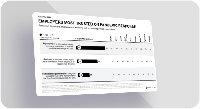 Since May 2020, EMPLOYERS MOST TRUSTED ON PANDEMIC RESPONSE Percent of Americans who say each are doing well on meeting overall expectations n 34 54 + a - - c n 8 5 5 1 3 5 + e k n ri e - 0 t c inX a n m s s s a t i e e e Change, May 2020 to March 2021 U.S. general population Whi Bl La As Ame Me Wo Ag Ag Ag My employer is doing well on meeting your overall expectations for how they +5 59 63 55 54 52 55 63 51 58 76 should be responding in this crisis Business is doing well on meeting your 47 overall expectations for how they should be +5 48 44 56 34 51 44 45 46 51 responding in this crisis The national government is doing well +2 35 on meeting your overall expectations for 33 45 39 36 38 33 32 33 40 how they should be responding in this crisis 2021 Edelman Trust Barometer Special Report: Trust and the Coronavirus. PER_EMP. When it comes to how your employer has performed thus far during the COVID-19 pandemic, how well do you believe it is currently doing each of the following? 5-point scale; top 2 box, doing well. Question asked among those who are employed (Q43/1). NEW_PER_BUS. When it comes to how it has performed thus far during the COVID-19 pandemic, how well do you believe business in general is currently doing each of the following? 5-point scale; top 2 box, doing well. NEW_PER_NATGOV. When it comes to how it has performed thus far during the COVID-19 pandemic, how well do you believe the national government of your country is currently doing each of the following? 5-point scale; top 2 box, doing well. General population, U.S., and by demographics. These questions were tracked back to the 2020 Trust Barometer Special Report: Spring Update. 32