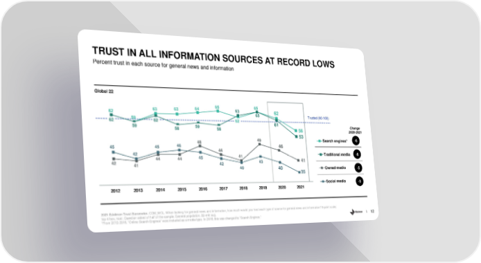 TRUST IN ALL INFORMATION SOURCES AT RECORD LOWS Percent trust in each source for general news and information Global 22 63 63 64 65 63 65 62 62 65 Trusted (60-100) 62 59 62 62 61 59 58 59 58 56 Change 2020-2021 49 53 Search engines* -6 46 48 46 45 45 44 42 45 41 Traditional media -8 42 44 44 43 41 41 42 40 40 35 Owned media -5 Social media -5 2012 2013 2014 2015 2016 2017 2018 2019 2020 2021 2021 Edelman Trust Barometer. COM_MCL. When looking for general news and information, how much would you trust each type of source for general news and information? 9-point scale; top 4 box, trust. Question asked of half of the sample. General population, 22-mkt avg. *From 2012-2015, “Online Search Engines” were included as a media type. In 2016, this was changed to “Search Engines.” 12