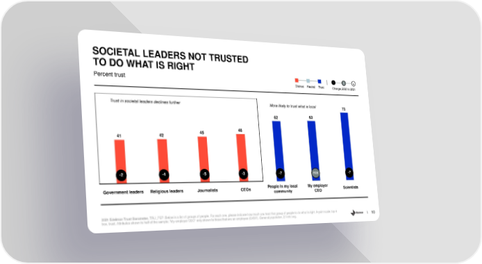 SOCIETAL LEADERS NOT TRUSTED TO DO WHAT IS RIGHT Percent trust - 0 + Distrust Neutral Trust Change, 2020 to 2021 Trust in societal leaders declines further More likely to trust what is local 73 62 63 45 48 41 42 -2 -4 -5 -3 -7 n/a -7 l l l l l l Government leaders Religious leaders Journalists CEOs People in my local My employer Scientists community CEO 2021 Edelman Trust Barometer. TRU_PEP. Below is a list of groups of people. For each one, please indicate how much you trust that group of people to do what is right. 9-point scale; top 4 box, trust. Attributes shown to half of the sample; “My employer CEO” only shown to those that are an employee (Q43/1). General population, 27-mkt avg. 10