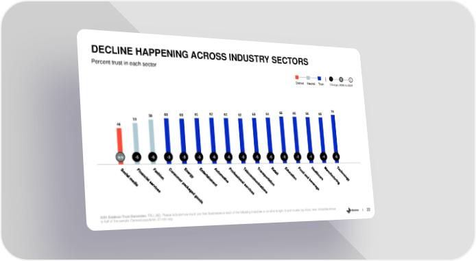 DECLINE HAPPENING ACROSS INDUSTRY SECTORS Percent trust in each sector - 0 + Distrust Neutral Trust Change, 2020 to 2021 66 66 66 66 70 60 60 61 62 62 62 63 64 53 58 46 n/a -5 -6 -3 -3 -5 -6 -6 -5 -5 -5 -3 -2 -1 -4 -6 lllllllllllllll 2021 Edelman Trust Barometer. TRU_IND. Please indicate how much you trust businesses in each of the following industries to do what is right. 9-point scale; top 4 box, trust. Industries shown to half of the sample. General population, 27-mkt avg. 22