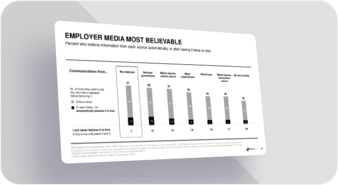 EMPLOYER MEDIA MOST BELIEVABLE Percent who believe information from each source automatically, or after seeing it twice or less My employer National Media reports, Major Advertising *Media reports, My social media Communications from… government named source corporations anonymous source 61 58 57 Nr. of times they need to see 52 the information repeated 46 46 before believing it: 39 Once or twice 49 45 47 If I see it here, I will 44 39 39 automatically assume it is true 33 12 13 10 8 7 7 6 I will never believe it is true 7 12 10 15 19 17 24 if this is the only place I see it 2021 Edelman Trust Barometer. HEAR_TIME1. When you see a new piece of information or a news story in each of the following information sources, how many times do you need to see it or hear it repeated in that same type of information source before you believe it is really true? Question asked of half of the sample. “Once or twice” is a sum of codes 2 and 3. General population, 27-mkt avg. “Employer communications” only shown to those that are an employee (Q43/1). *”Media reports, anonymous source” excludes Canada and France. 14