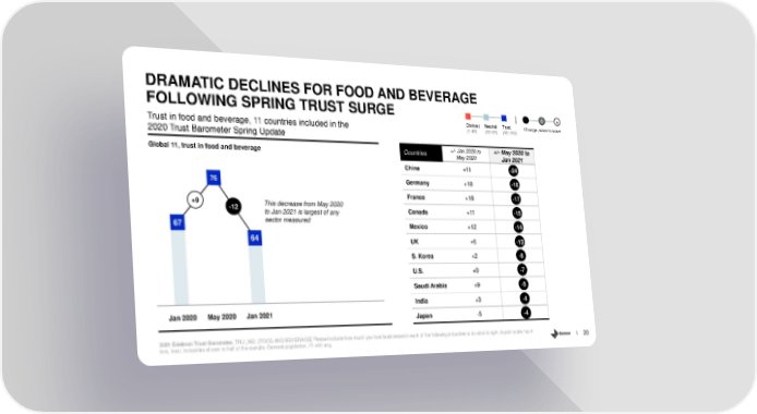 DRAMATIC DECLINES FOR FOOD AND BEVERAGE FOLLOWING SPRING TRUST SURGE - 0 + Distrust Neutral Trust Change, wave to wave Trust in food and beverage, 11 countries included in the (1-49) (50-59) (60-100) 2020 Trust Barometer Spring Update Global 11, trust in food and beverage Countries +/- Jan 2020 to +/- May 2020 to May 2020 Jan 2021 China +11 -24 -17 76 Germany +18 -18 -15 France +18 -17 +9 -13 -12 This decrease from May 2020 Canada +11 -15 to Jan 2021 is largest of any -12 67 sector measured Mexico +12 -14 -11 64 UK +6 -8 -13 S. Korea +2 -8 -6 U.S. +9 -7 -5 Saudi Arabia +9 -5 -1 India +3 -4 -1 Jan 2020 May 2020 Jan 2021 Japan -5 -4 2 2021 Edelman Trust Barometer. TRU_IND. [FOOD AND BEVERAGE] Please indicate how much you trust businesses in each of the following industries to do what is right. 9-point scale; top 4 box, trust. Industries shown to half of the sample. General population, 11-mkt avg. 20