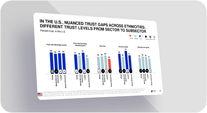 IN THE U.S., NUANCED TRUST GAPS ACROSS ETHNICITIES; DIFFERENT TRUST LEVELS FROM SECTOR TO SUBSECTOR Percent trust, in the U.S. - 0 + Distrust Neutral Trust Change, 2020 to 2021 Food and beverage Food and Beverage sector manufacturers Fast food Grocery stores Brewing and spirits 76 66 62 64 64 61 67 66 61 58 55 56 59 56 54 58 56 51 48 51 0 -1 +4 +6 +2 -1 +4 -11 +4 -1 +5 -3 -5 -11 +8 -7 -6 -2 -9 +5 et n n nX n te n n nX n te n n nX n te n n nX n te n n nX n carica ati ca ricaca ti ca ricaca ca ricaca ti ca ricaca ti ca Whi f L Whi f La Whi f Lati Whi f La Whi f La k/AAmeri Ameri k/AAmeri Ameri k/AAmeri Ameri k/A Ameri Ameri k/AAmeri Ameri acl- - lac- - lac- - lac - - lac- - B sian B sian B sian B sian B sian A A A A A 2021 Edelman Trust Barometer. TRU_IND. [FOOD AND BEVERAGE] Please indicate how much you trust businesses in each of the following industries to do what is right. 9-point scale; top 4 box, trust. Industries shown to half of the sample. TRU_SUB_FBV. Now thinking about specific sectors within the food industry, please indicate how much you trust businesses in each of the following sectors to do what is right. 9-point scale; top 4 box, trust. Question asked of one-fifth of the sample. U.S., among Non-Hispanic White, Black, LatinX and Asian populations. 28