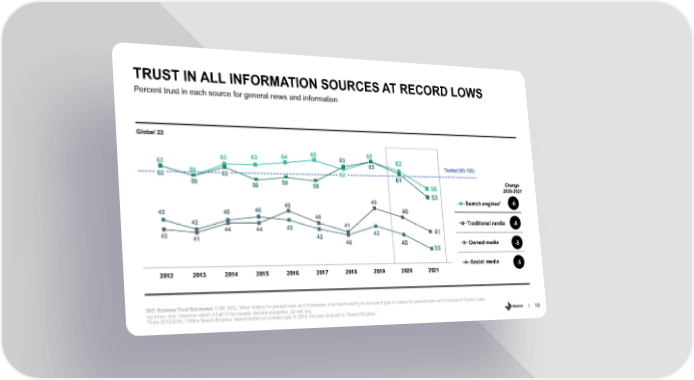 TRUST IN ALL INFORMATION SOURCES AT RECORD LOWS Percent trust in each source for general news and information Global 22 63 63 64 65 63 65 62 62 65 Trusted (60-100) 62 59 62 62 61 59 58 59 58 56 Change 2020-2021 49 53 Search engines* -6 46 48 46 45 45 44 42 45 41 Traditional media -8 42 44 44 43 41 41 42 40 40 35 Owned media -5 Social media -5 2012 2013 2014 2015 2016 2017 2018 2019 2020 2021 2021 Edelman Trust Barometer. COM_MCL. When looking for general news and information, how much would you trust each type of source for general news and information? 9-point scale; top 4 box, trust. Question asked of half of the sample. General population, 22-mkt avg. *From 2012-2015, “Online Search Engines” were included as a media type. In 2016, this was changed to “Search Engines.” 16