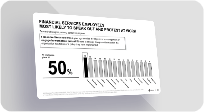 FINANCIAL SERVICES EMPLOYEES MOST LIKELY TO SPEAK OUT AND PROTEST AT WORK Percent who agree, among sector employees I am more likely now than a year ago to voice my objections to management or engage in workplace protest if I were to strongly disagree with an action the organization has taken or a policy they have implemented All employees, 62 59 global 27 54 53 53 53 52 51 50 50 50 50% 47 47 47 45 Fin Te Ma Fa Pr Te En Fo CP Re Tra Ed En He Au a c n sh o le e o G t n u te a t h f r d a c l o n n u i e c g i s a r t m o o l h c o f s y a p t t i a n s m n o i a c o a l c i o i a l o t o m d r n t s g u n t n m re i e y a s b a v r r l e t e e i v i v n s o n ic g e e n t e r ra s vi g ces e 2021 Edelman Trust Barometer. EMP_ENG. Thinking about your current employer, to what extent do you agree with the following statements? 9-point scale; top 4 box, agree. Question asked of those who are an employee (Q43/1). General population, 27-mkt avg., and among those employed in each sector (Q43/1 AND Q420). 23