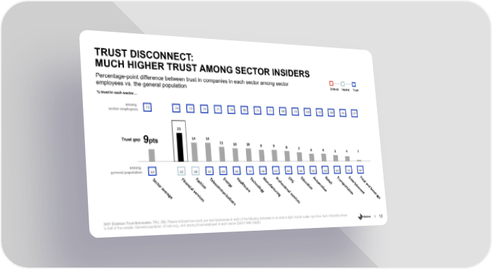 TRUST DISCONNECT: MUCH HIGHER TRUST AMONG SECTOR INSIDERS Percentage-point difference between trust in companies in each sector among sector Distrust Neutral Trust employees vs. the general population % trust in each sector… among 72 74 72 76 71 76 80 75 71 68 73 68 70 68 65 67 sector employees * *************** 21 Trust gap 9pts 14 14 11 10 10 9 9 8 7 6 6 5 4 1 among general population 63 53 58 62 60 66 70 66 62 60 66 62 64 63 61 66 * *************** Se Fi Fa Te En He Te Ma Pr CP Ed Au Re Tr En Fo c n s l e a c o G u t t a t o t a h e r l h n f c o a n e d o n i c g t n u e a m i s r r c o o y h o f s t l p t a i n m c a s i o o a n a a a l i o i ve l m r o c o n t r n d g t n i t m s u e y u v a b r e r a e t e e a r n i l i g v i n s o n v e i c g e n t e c a r r e t v a s i i g o c e ns es 2021 Edelman Trust Barometer. TRU_IND. Please indicate how much you trust businesses in each of the following industries to do what is right. 9-point scale; top 4 box, trust. Industries shown to half of the sample. General population, 27-mkt avg., and among those employed in each sector (Q43/1 AND Q420). 12
