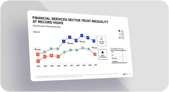 FINANCIAL SERVICES SECTOR TRUST INEQUALITY AT RECORD HIGHS Percent trust in financial services Trust (60-100) Global 22 Neutral 67 (50-59) Distrust 65 65 (1-49) 61 62 12pt gap 62 Informed 12pt gap Public 6ptgap 54 54 55 54 13pt gap Trust inequality, 2021 (pts.) 53 53 51 51 U.S. 14 49 48 49 Mass UK 10 47 47 Population Germany 4 43 Singapore -1 2012 2013 2014 2015 2016 2017 2018 2019 2020 2021 2021 Edelman Trust Barometer. TRU_IND. [FINANCIAL SERVICES] Please indicate how much you trust businesses in each of the following industries to do what is right. 9-point scale; top 4 box, trust. Industries shown to half of the sample. Informed public and mass population, 22-mkt avg. 11