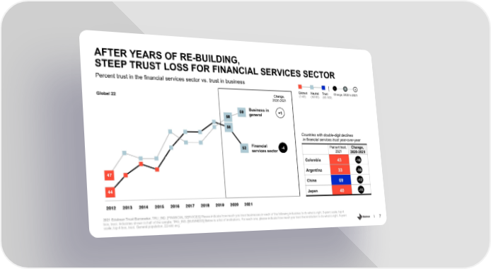 AFTER YEARS OF RE-BUILDING, STEEP TRUST LOSS FOR FINANCIAL SERVICES SECTOR Percent trust in the financial services sector vs. trust in business - 0 + Distrust Neutral Trust Change, 2020 to 2021 Change, (1-49) (50-59) (60-100) Global 22 2020-2021 59 Business in +1 58 general 56 Countries with double-digit declines in financial services trust year-over-year 52 Financial -4 Percent trust, Change, services sector 2021 2020-2021 Colombia -15 43 -16 Argentina -13 47 33 -16 China -12 69 -12 44 Japan 40 --1111 2012 2013 2014 2015 2016 2017 2018 2019 2020 2021 2021 Edelman Trust Barometer. TRU_IND. [FINANCIAL SERVICES] Please indicate how much you trust businesses in each of the following industries to do what is right. 9-point scale; top 4 box, trust. Industries shown to half of the sample. TRU_INS. [BUSINESS] Below is a list of institutions. For each one, please indicate how much you trust that institution to do what is right. 9-point scale; top 4 box, trust. General population, 22-mkt avg. 7