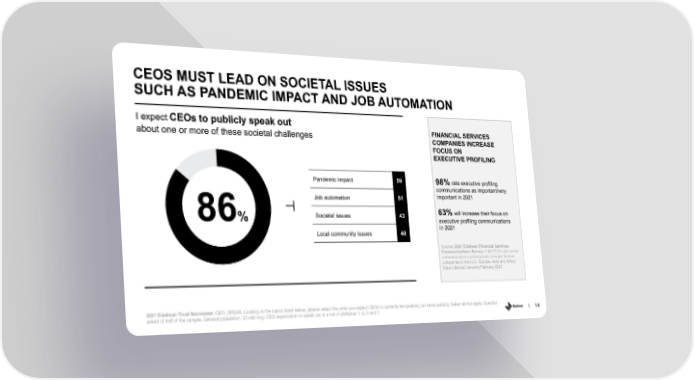 CEOS MUST LEAD ON SOCIETAL ISSUES SUCH AS PANDEMIC IMPACT AND JOB AUTOMATION I expect CEOs to publicly speak out FINANCIAL SERVICES about one or more of these societal challenges COMPANIES INCREASE FOCUS ON EXECUTIVE PROFILING Pandemic impact 59 98%rate executive profiling communications as important/very Job automation 51 important in 2021 86% Societal issues 43 63%will increase their focus on executive profiling communications Local community issues 40 in 2021 Source: 2021 Edelman Financial Services Communications Survey of 40 CCOs and senior communications professionals at major finance companies in the U.S., Europe, Asia and Africa, Data collected January-February 2021. 2021 Edelman Trust Barometer. CEO_SPEAK. Looking at the topics listed below, please select the ones you expect CEOs to currently be speaking out about publicly. Select all that apply. Question asked of half of the sample. General population, 27-mkt avg. CEO expectation to speak out is a net of attributes 1, 2, 5 and 7. 14