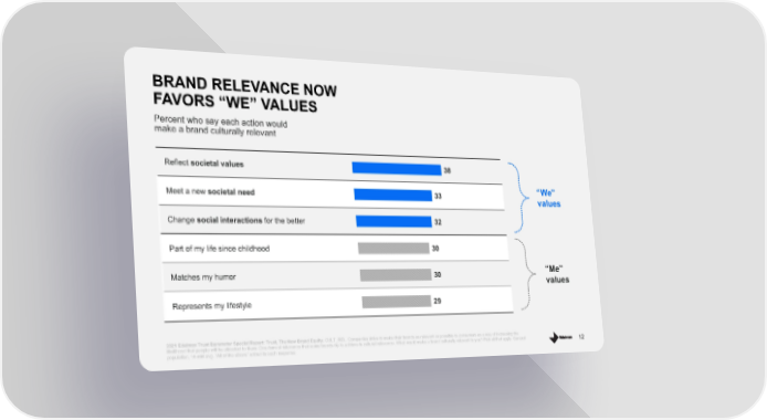 BRAND RELEVANCE NOW FAVORS “WE” VALUES Percent who say each action would make a brand culturally relevant Reflect societal values 38 Meet a new societal need 33 “We” values Changesocial interactions for the better 32 Part of my life since childhood 30 Matches my humor 30 “Me” values Represents my lifestyle 29 2021 Edelman Trust Barometer Special Report: Trust, The New Brand Equity. CULT_REL. Companies strive to make their brands as relevant as possible to consumers as a way of increasing the likelihood that people will be attracted to them. One form of relevance that some brands try to achieve is cultural relevance. What would make a brand culturally relevant to you? Pick all that apply. General 12 population, 14-mkt avg. “All of the above” added to each response.