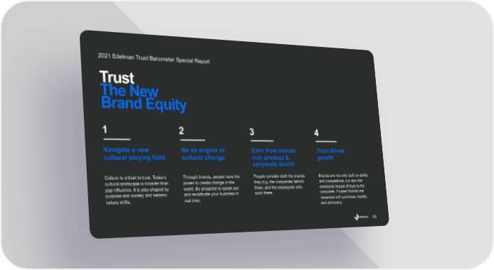 2021 Edelman Trust Barometer Special Report Trust The New Brand Equity 1 2 3 4 Navigate a new Be an engine of Earn trust across Trust drives cultural playing field cultural change both product & growth corporate brand Culture is critical to trust. Today’s Through brands, people have the People consider both the brands Brands are not only built on ability cultural landscape is broader than power to create change in the they buy, the companies behind and competence, but also the pop influence. It is also shaped by world. Be prepared to speak out them, and the employees who emotional impact of trust to the purpose and society and seismic and recalibrate your business in work there. consumer. Trusted brands are values shifts. real time. rewarded with purchase, loyalty, and advocacy. 29